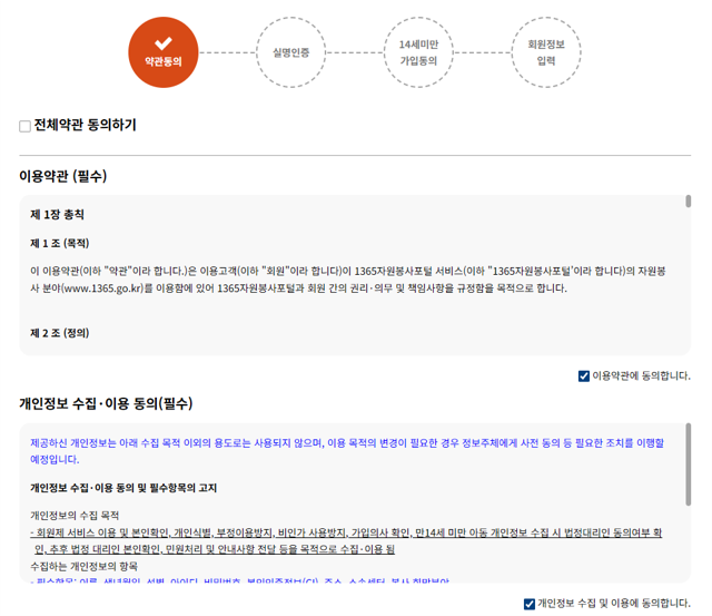 ⑤ 첫 화면의 주민등록처리동의를 선택한 경우 실명인증. 저장 버튼 클릭 시 회원가입 완료되며, 선택사항 입력 버튼 클릭 시 부가정보 입력으로 이동