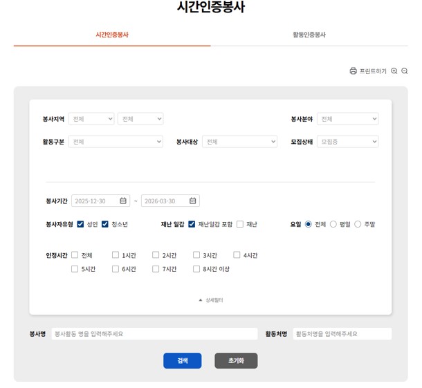 ① 개인봉사참여 메뉴에서 원하는 지역/분야/대상을 선택하여 조건별 검색