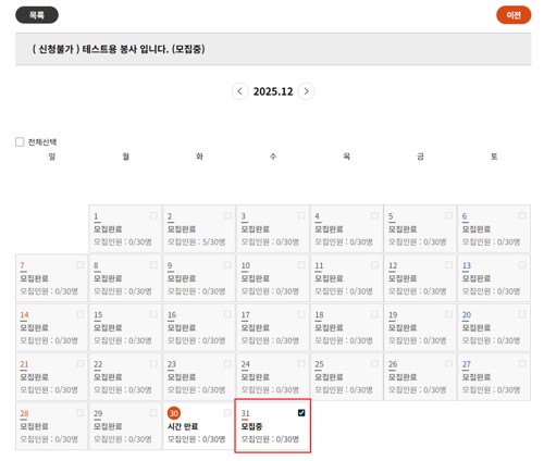 ④ 달력에서 원하는 날짜를 선택 후 자원봉사활동 신청