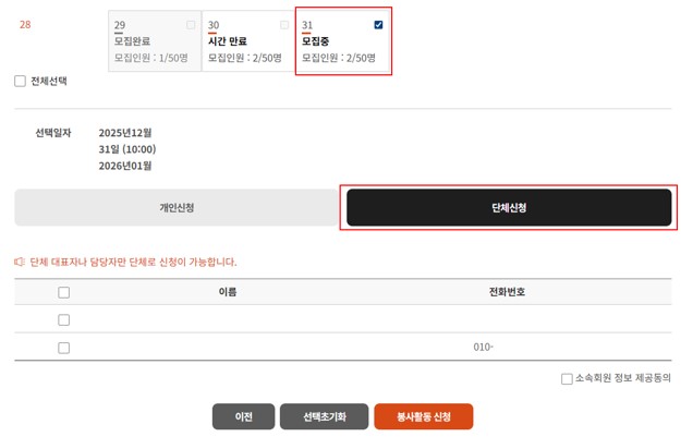 ④ 달력에서 원하는 날짜를 선택하고, 참여할 단체구성원을 선택하여 자원봉사활동 신청